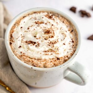 - Sweeten to desired taste and pour into mug. Top with dairy-free whip cream and shaved chocolate if desired. Enjoy!